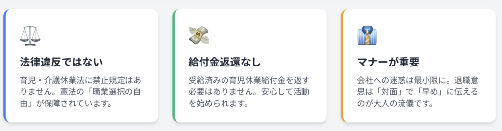 「育休は復帰前提の制度なのに、転職活動なんてしてもいいの?」と不安に感じるかもしれませんが、法的に見ると全く問題ありません。この安心感が、活動の第一歩です。