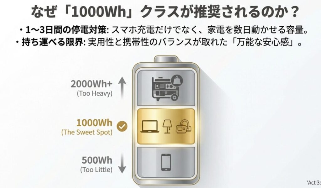 1000Wh前後の容量は、1日〜3日程度の停電対策として推奨される目安です。