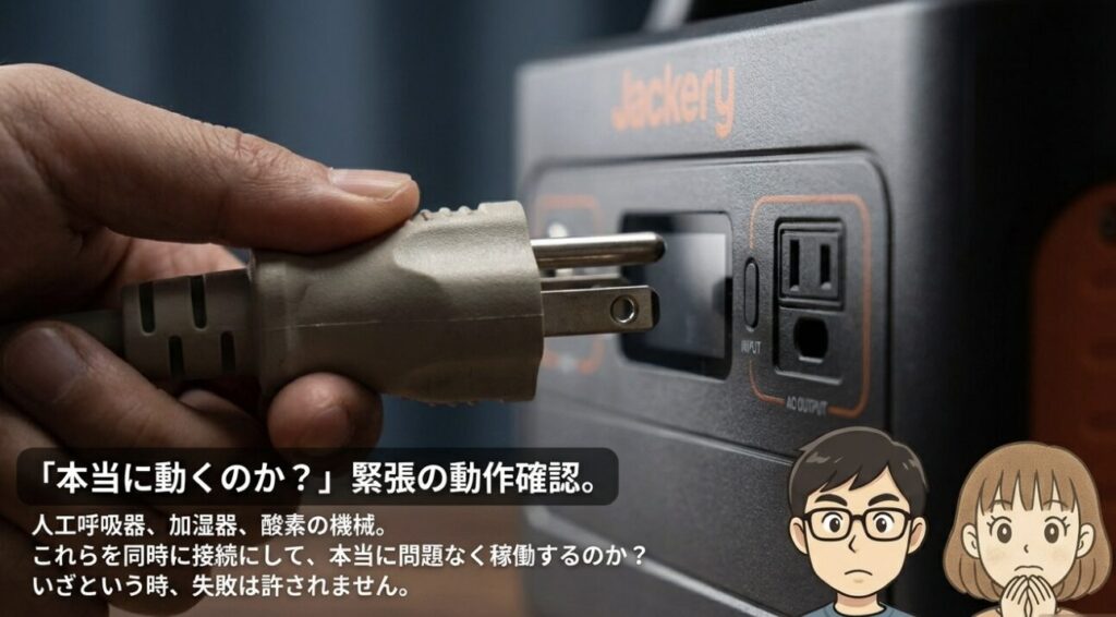 我が家では実際に、人工呼吸器・加湿器・酸素濃縮器をJackeryに繋いで動作確認を行いました。